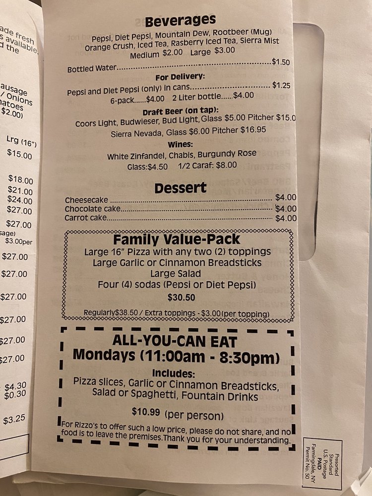 Rizzo's offers a seamless experience: whether you’re dining in, taking out, or enjoying delivery, their friendly staff is dedicated to ensuring your meal is exceptional. The large pepperoni and mushroom pizza, known for its crispy texture and balanced sweetness in the sauce, delightfully stands out. Don't miss the garlic knots—soft, buttery, and seasoned to perfection!